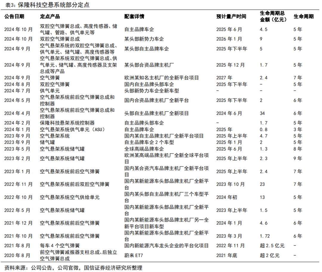 保隆科技空悬已披露在手订单超122亿元,具备供应集成空气悬架能力,首获外资车企定点。保隆科技2017年进入乘用车空气弹簧领域,目前已实现配方、混炼、压延、成型、硫化、装配全工艺链自主掌控,通过长期的研发和生产实践,覆盖空气弹簧、电控减振器、控制系统、储气罐、悬架高度传感器、车身加速度传感器多个产品核心技术体系,具备全系统开发能力,与国内外成熟车企如大众、奥迪、保时捷、宝马、奔驰、丰田、上汽、东风、长安、一汽等,电动车龙头企业如比亚迪、蔚来、小鹏、理想、零跑、合众等,知名一级零部件供应商如佛吉亚、天纳克、博格华纳、马瑞利等建立长期、稳定供货关系。2024年9月,公司首次获得欧洲某知名主机厂的全新平台项目的空气悬架系统前后空气弹簧,这也是国内空气弹簧供应商的首次突破,国内空簧从依靠进口到自主生产进一步到反向出口时代。