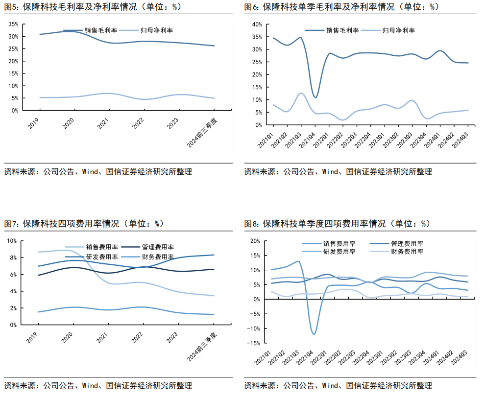 公司24Q3净利率环比上升0.54pct。公司24Q3毛利率24.6%,同比下降3.55pct,环比下降0.48pct;归母净利润5.78%,同比下降3.93pct,环比上升0.54pct。其中销售/管理/研发/财务费用率分别为3.09%/5.91%/7.92%/0.87%,同比+1.01/-0.32/+0.45/-1.02pct,环比-0.61/-0.61/-0.31/-0.25pct。