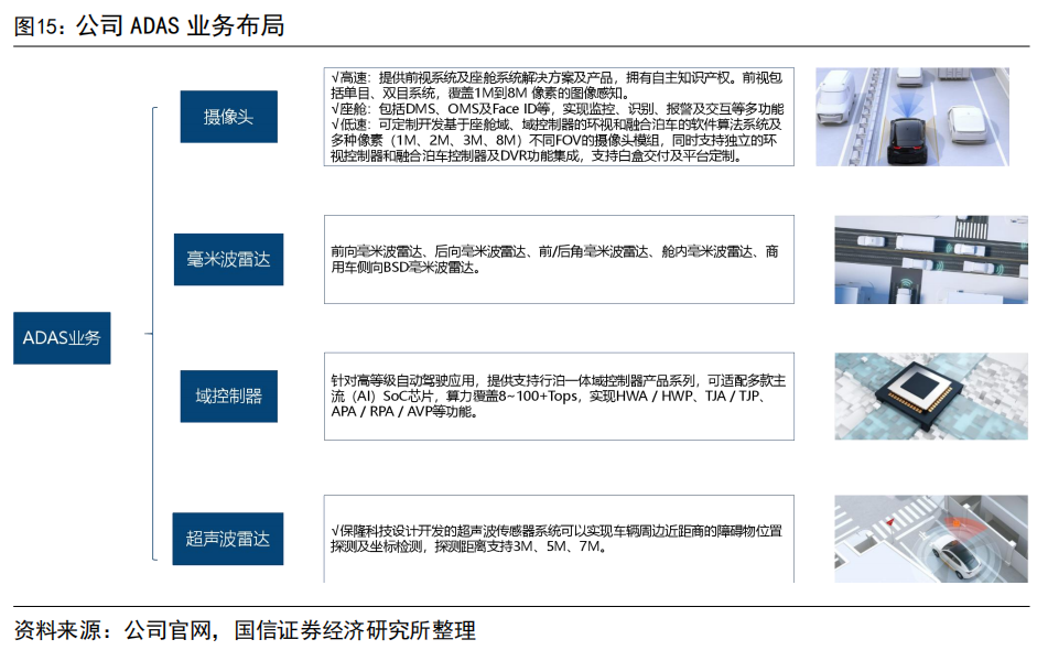 保隆形成6类40种车身传感器布局,同时切入环境传感器+域控,完善智驾感知、规划布局