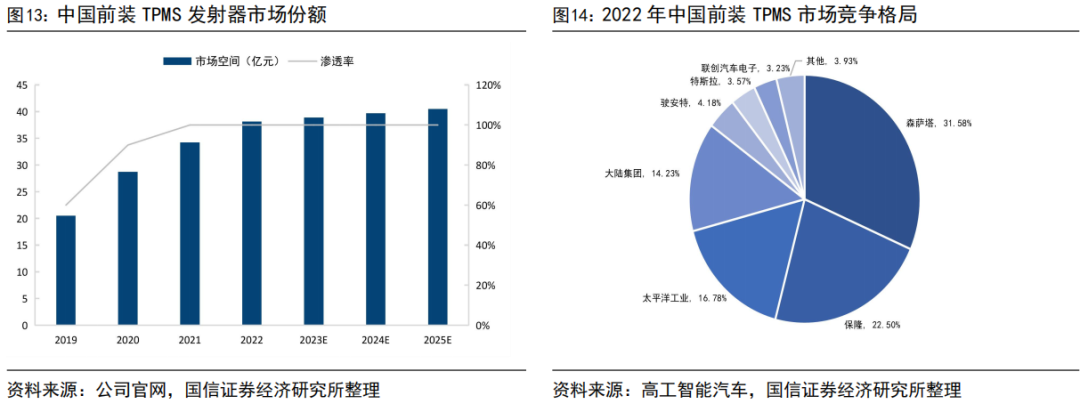 TPMS业务前装政策驱动,公司稳居国内份额第一。2017年发布的《乘用车轮胎气压监测系统的性能要求和试验方法》强制要求2019 年1月1日起中国市场所有新认证乘用车必须安装TPMS:自2020年1月1日起,所有生产的乘用车开始实施强制安装,据此我们假设中国乘用车前装TPMS自2019年开始渗透率为60%、90%、100%,2021年及之后渗透率维持100%不变,根据保隆科技披露数据计算TPMS发射器单价在40元左右,按照单车配备4个发射器,中国TPMS发射器业务市场规模有望在2023年达到39亿元,之后将伴随乘用车销量同步增长。保隆科技TPMS项目从2006年正式实现量产,2009年被特斯拉确定为TPMS产品唯一定点供应商,并为2010款Roadster跑车提供配套。2019年1月,保隆科技与德国霍富合资公司保富电子正式运营,专业经营TPMS产品,合并当年保富中国生产TPMS发射器约1100万支,同比增长25%,公司业务飞速发展。至2023年末,公司TPMS业务收入19.11亿元,当年共销售TPMS发射器5448万只。