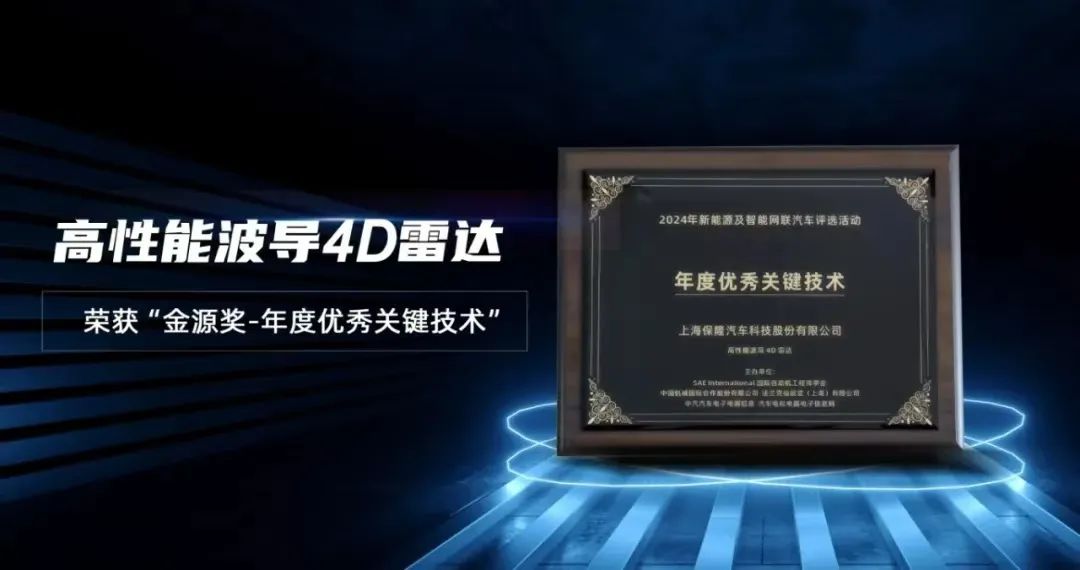 在近日举行的“2024年新能源及智能网联汽车评选活动”中,松江企业保隆科技以“高性能波导4D雷达”荣获“金源奖—年度优秀关键技术”奖项。