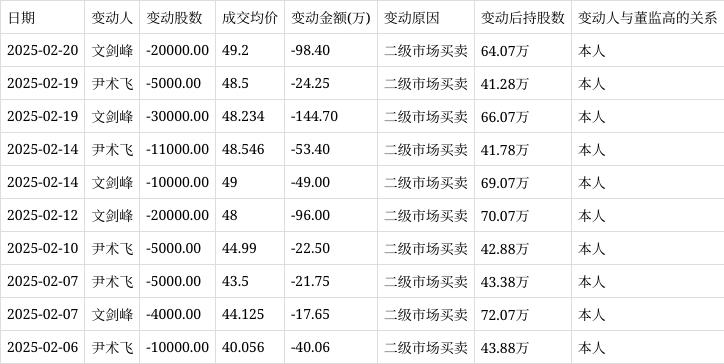 上交所公开信息显示,2月20日,保隆科技高级管理人员文剑峰在二级市场买卖公司股票,减持股数2.00万股,成交均价49.20元,变动金额98.40万元,变动后持股数为64.07万股。