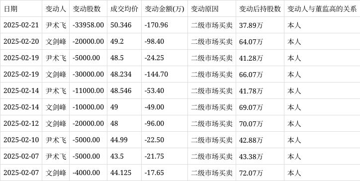上交所公开信息显示,2月21日,保隆科技高级管理人员尹术飞在二级市场买卖公司股票,减持股数3.40万股,成交均价50.35元,变动金额170.96万元,变动后持股数为37.89万股。