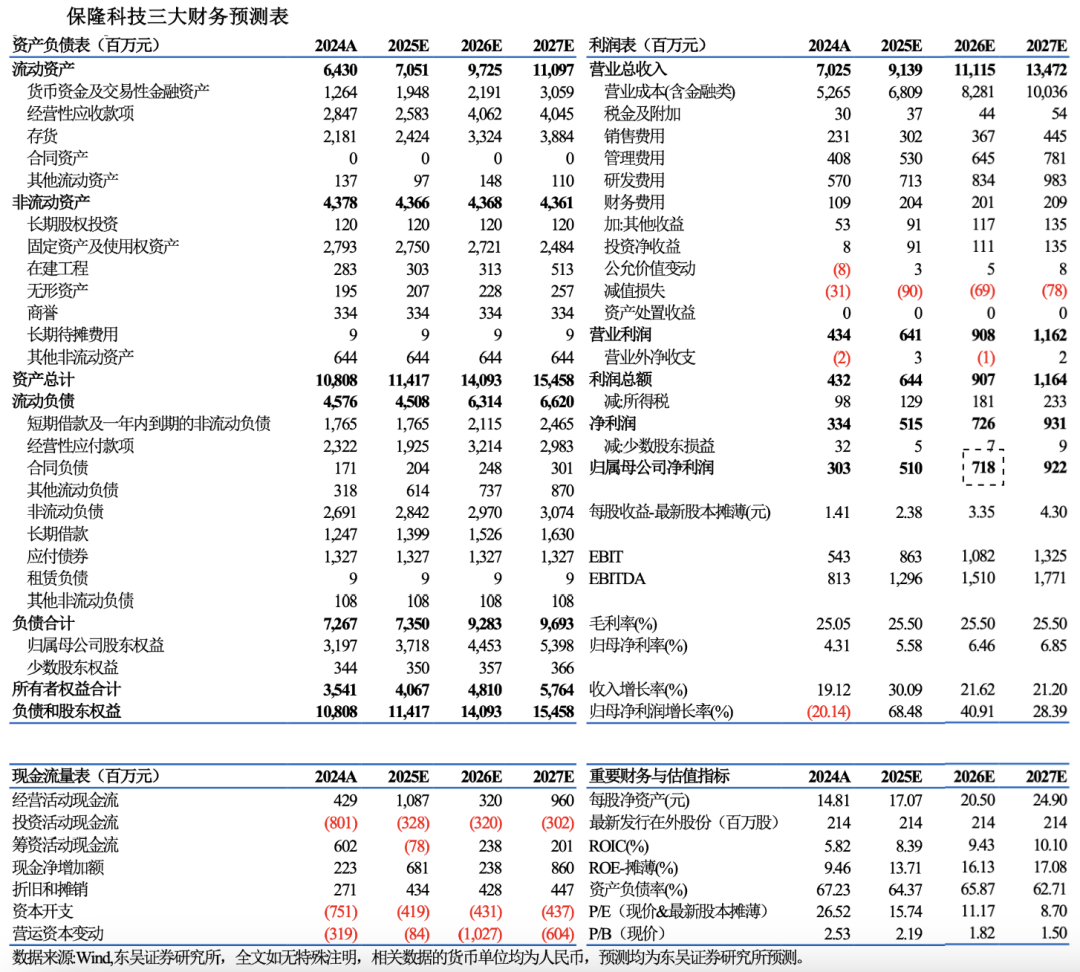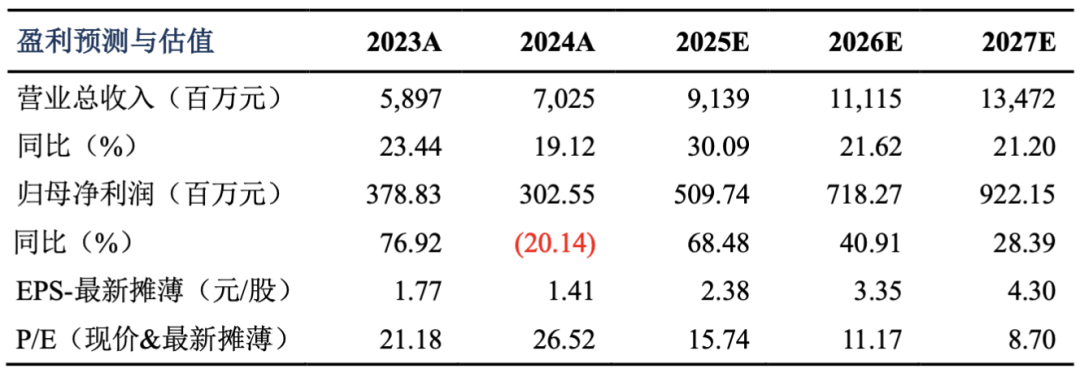 由于公司传统业务增速放缓,且新产品放量对整体毛利率有所影响,我们下调2025-2026年营收预测为91/111亿元(原为95/115亿元),预计2027年营收为135亿元,同比分别+30%/+22%/+21%;下调2025-2026年归母净利润为5.1/7.2亿元(原为5.9/7.8亿元),预计2027年归母净利润为9.2亿元,同比分别+68%/+41%/+28%,对应PE分别为16/11/9倍,维持“买入”评级。