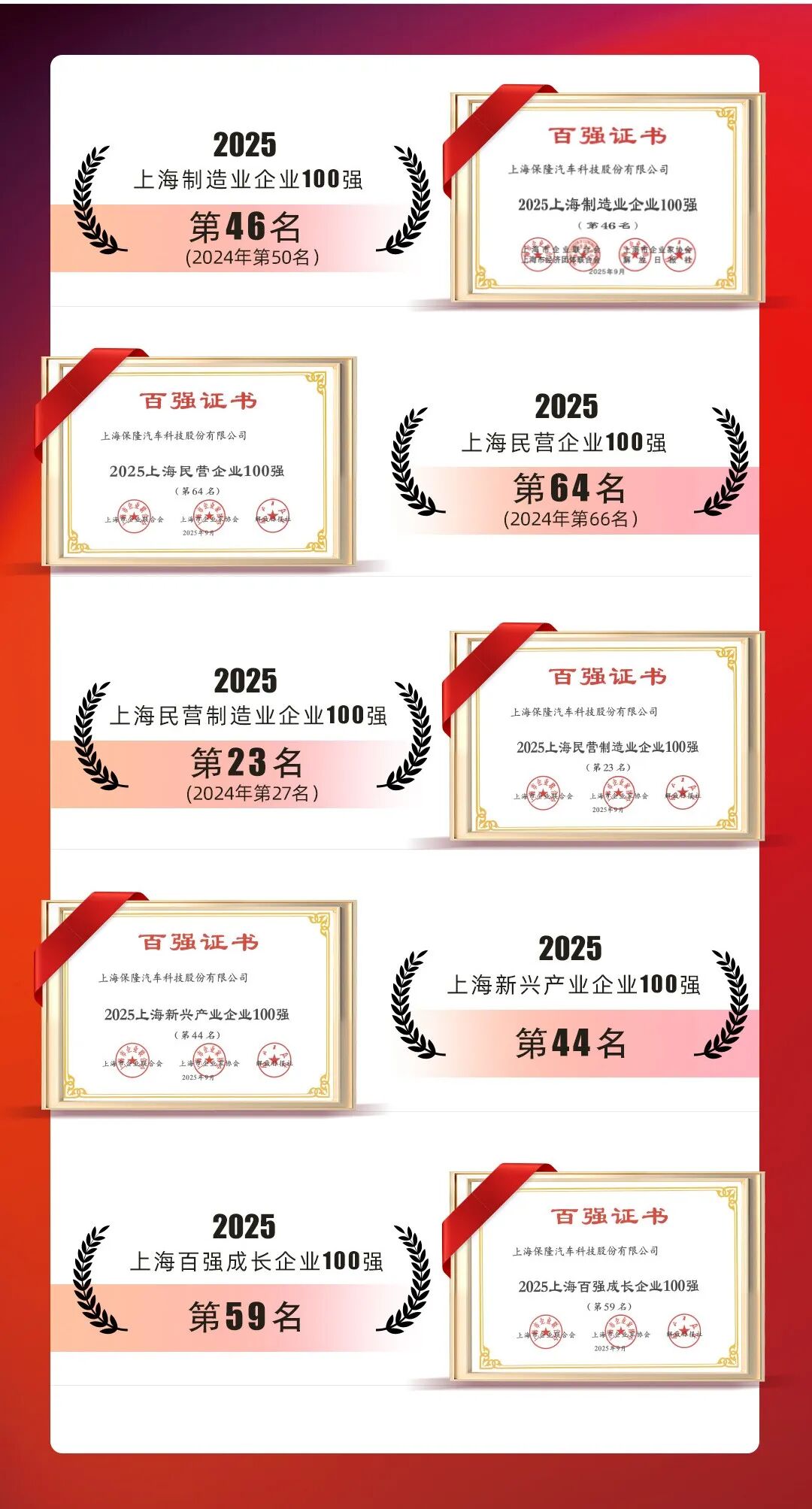 9月23日,上海市企业联合会、上海市企业家协会、上海市经济团体联合会和解放日报社召开新闻发布会,联合发布2025上海企业100强名单,保隆科技凭借优秀的经营表现荣登5项上海百强企业榜单名录,本次是保隆科技第17次荣登上海百强榜单。