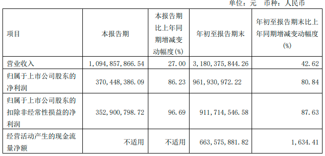 10月27日,迎驾贡酒(SH603198)公告,第三季度营业收入约10.95亿元,比上年同期增长27%,归属于上市公司股东的净利润约3.7亿元,比上年同期增长86.23%,归属于上市公司股东的扣除非经常性损益的净利润约3.53亿元,比上年同期增长96.69%,基本每股收益0.46元/股,比上年同期增长91.67%,总资产约75.99亿元,比上年同期增长2.94%。