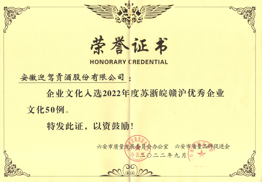 9月9日,2022年六安市“质量月”活动启动仪式暨质量文化进高校活动在安徽国防科技职业学院举行。启动仪式通报了2022年六安市“质量月”活动安排,宣读了2022年苏浙皖赣沪优秀企业文化获奖名单。安徽迎驾贡酒股份有限公司报送的《生态引领文化铸魂》企业文化案例成功入选苏浙皖赣沪优秀企业文化50例。