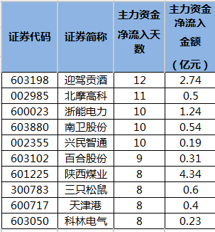 证券时报网讯,数据宝统计,截至12月14日收盘,沪深两市共有54只个股连续5个交易日以上获主力资金持续净流入。连续流入天数最多的是迎驾贡酒,已连续12个交易日净流入。连续净流入天数较多的还有北摩高科、浙能电力、南卫股份、兴民智通、百合股份,分别获11个、10个、10个、10个、9个交易日净流入。