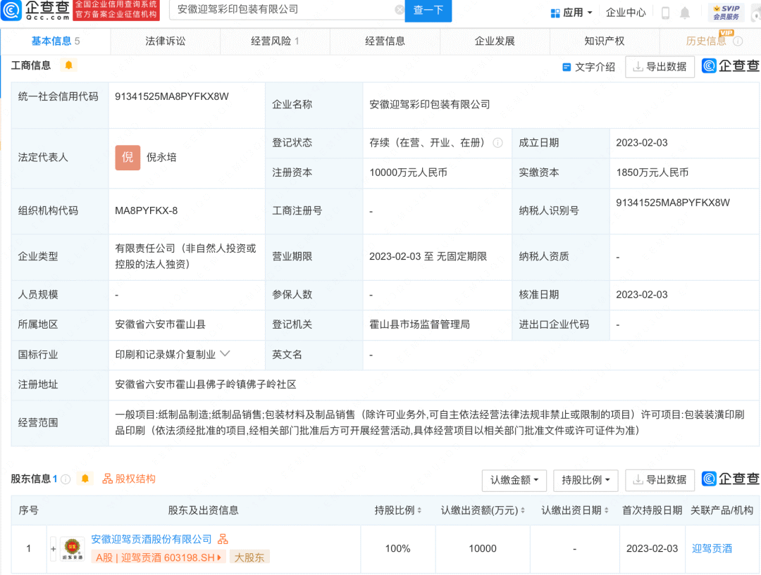 近日,安徽迎驾彩印包装有限公司成立,法定代表人为倪永培,注册资本1亿元人民币,经营范围包含:纸制品制造;纸制品销售;包装材料及制品销售等。该公司由迎驾贡酒(603198)100%控股。