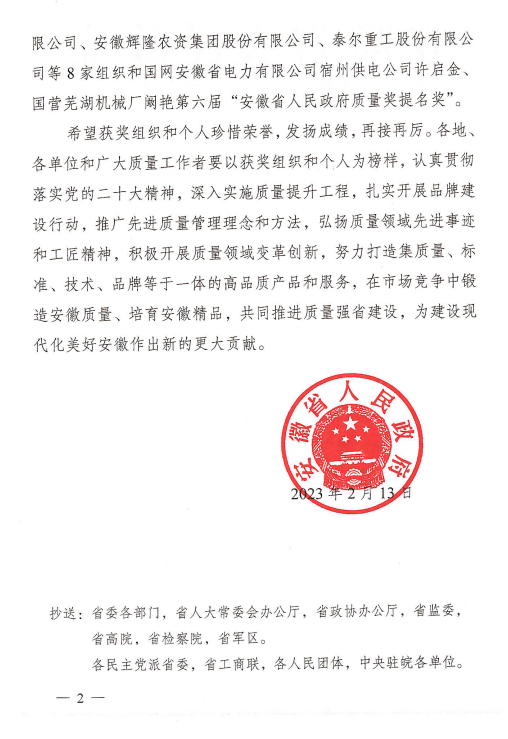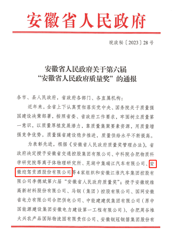 近日,安徽省人民政府发布《关于第六届“安徽省人民政府质量奖”的通报》(皖政秘〔2023〕28号),迎驾贡酒荣获第六届“安徽省人民政府质量奖”,实现了六安市省政府质量奖“零”的突破。
