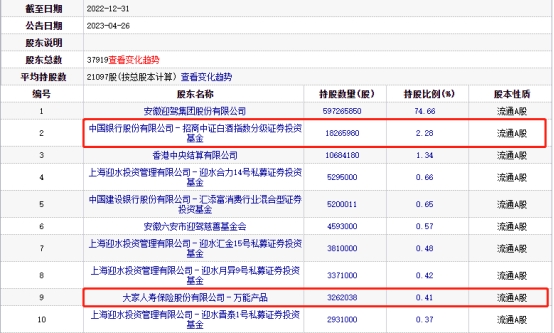 截至2022年12月31日,中国银行股份有限公司-招商中证白酒指数分级证券投资基金为迎驾贡酒第二大流通股东,持股数量为18265980股,占流通股比例2.28%;大家人寿保险股份有限公司-万能产品为迎驾贡酒第九大流通股东,持股数量为3262038股,占流通股比例0.41%