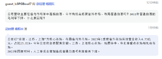 会上,有投资者提问称,公司营收主要在省内市场和中高档白酒,今年有机会拓展省外市场、布局普通白酒吗?2022年普通白酒的毛利率下降,什么原因呢?