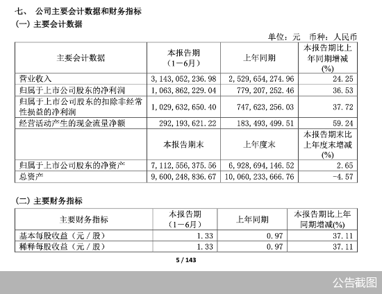迎驾贡酒今年1-6月实现营收31.43亿元,同比增长24.25%;实现净利润10.64亿元,同比增长36.53%。对于业绩的增长,迎驾贡酒表示,主要是以洞藏系列为代表的中高档白酒产品收入增长所致。