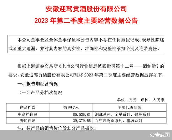 从产品来看,今年二季度,迎驾贡酒中高档白酒、普通白酒分别实现销售收入8.55亿元、2.94亿元。与去年同期的6.13亿元、2.61亿元相比,中高档酒实现快速增长。据了解,迎驾贡酒中高档白酒为洞藏系列、金星系列、银星系列;普通白酒为百年迎驾贡系列、糟坊系列。
