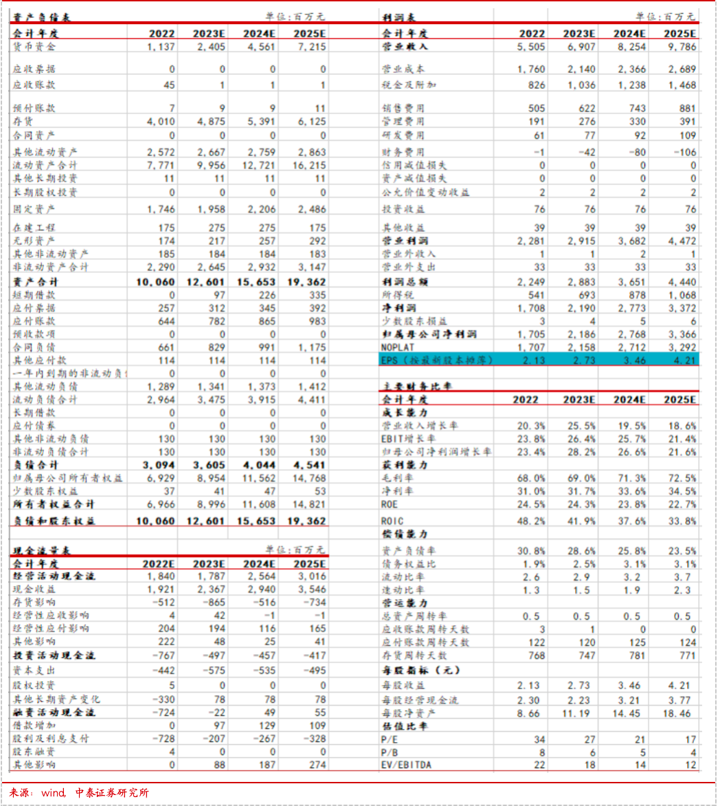 盈利预测:我们维持盈利预测,预计2023-2025年公司分别实现营业收入69.07、82.54、97.86亿元,同比增长25.45%、19.51%、18.56%,实现净利润21.86、27.68、33.67亿元,同比增长28.19%、26.64%、21.66%;对应EPS分别为2.73、3.46、4.21元。当前股价对应未来三年估值为27倍、21倍、17倍。维持“买入”评级。重点推荐。