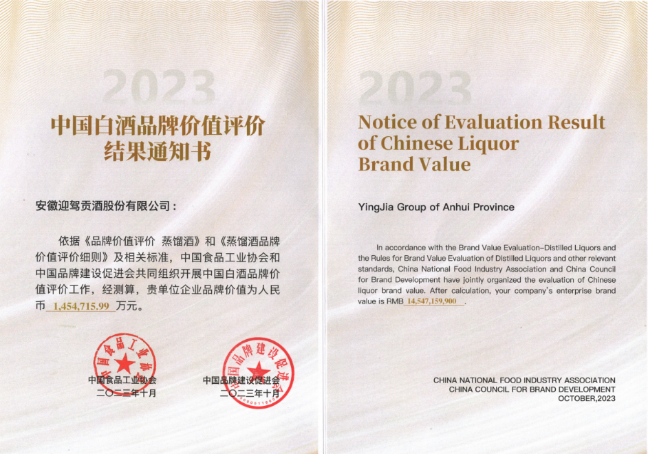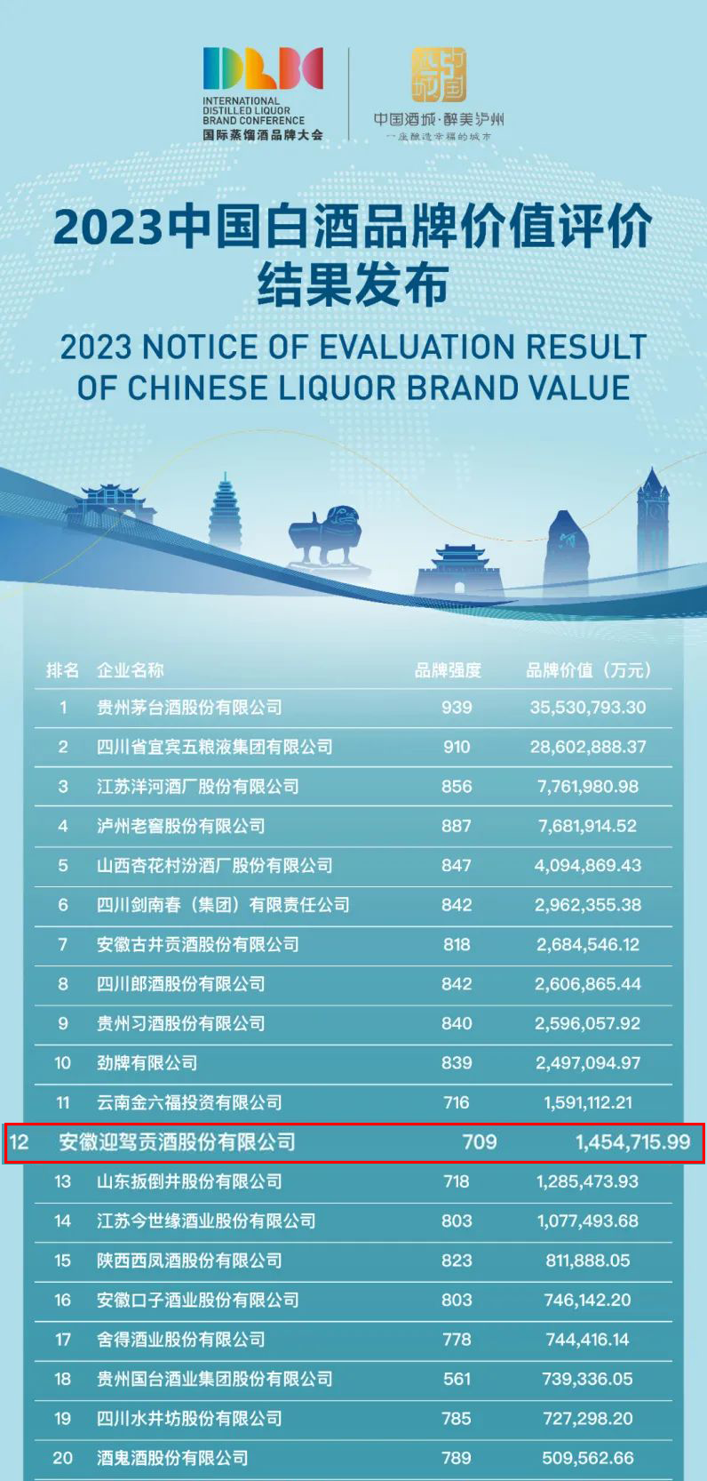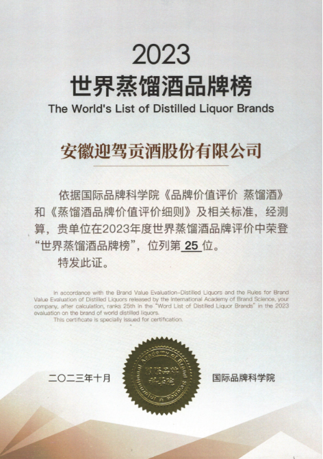 会上,《世界蒸馏酒品牌榜》和《中国白酒品牌价值榜》两项权威榜单发布,迎驾贡酒凭借卓越的品质实力和品牌影响力荣登世界蒸馏酒品牌榜第25名、中国白酒品牌价值榜第12名,品牌价值再攀新高度。