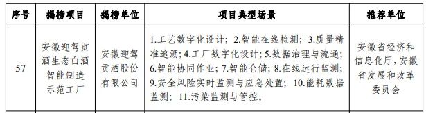 根据公告,迎驾贡酒共有11个经典场景上榜,包括工艺数字化设计、智能在线检测、质量精准追溯、工厂数字化设计、数据治理与流通、智能协同作业、智能仓储、在线运行监测、安全风险实时监测与应急处置、能耗数据监测、污染监测与管控。