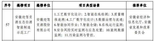 根据公告,迎驾贡酒共有11个经典场景上榜,包括工艺数字化设计、智能在线检测、质量精准追溯、工厂数字化设计、数据治理与流通、智能协同作业、智能仓储、在线运行监测、安全风险实时监测与应急处置、能耗数据监测、污染监测与管控。从揭榜的项目来看,迎驾贡酒已经实现了生产制造系统的数据实时采集、传输、分析、预警等功能,以及原酒酿造、成品酒灌装、仓储物流全过程的智能管控,搭建的数据化营销平台,实现了产品从“生产—仓储—物流—终端—消费者”的全生命周期溯源识别系统,以智能赋能白酒生产制造的全流程。通过生产流程的全面智能化,迎驾贡酒实现了标准化管理,不仅大幅提高生产效率,还在更加规范的工艺执行中,实现更加稳定的原酒质量把控,将高质量落实于产品之中。
