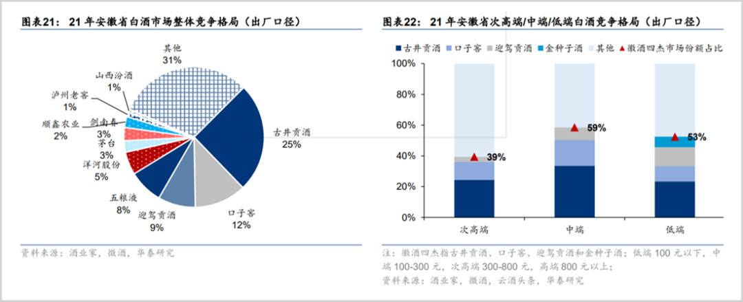 从徽酒市场竞争格局上看,以“四朵金花”为代表的地产酒品牌仍占据着绝对优势。据华泰证券研究,徽酒品牌在安徽当地的销售比例持续提升,从2018年的约60%提升到了2021年的66%左右。