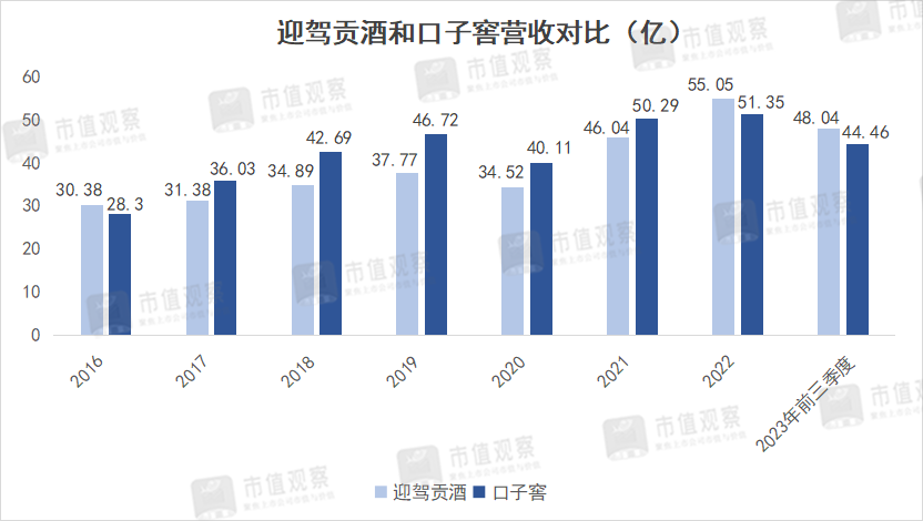 虽然迎驾贡酒增长的势头很猛,但省内老二的地位仍然没有站稳。一方面与口子窖的业绩规模并没有明显拉大,2023年前三季度营收仅有不足4个亿的差距。