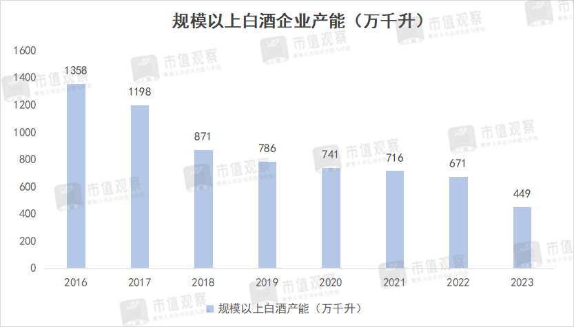 近年来,白酒行业的整体产能逐年萎缩。据官方数据统计,2023年全年规模以上白酒企业产能为449万千升,相较于2022年下降了33%,仅为2016年产能规模的三分之一。
