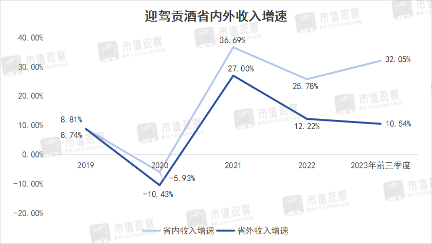 因此要想达成百亿目标,迎驾贡酒只依靠省内这一条路注定行不通,加速省外市场开拓是必选项。但公司省外市场开拓并不顺利,相对于省内增速明显放缓,自2021年后省外市场增速只在10%左右,低于省内的25%以上增速。