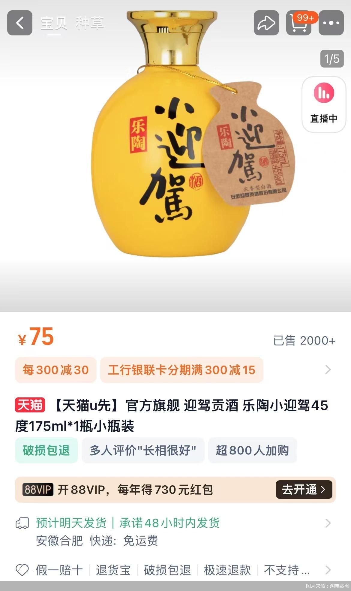 北京商报记者登录迎驾贡酒天猫旗舰店发现,目前店铺内所售产品涉及迎驾贡酒旗下各档位产品,其中销量最高的产品为45度175ml迎驾贡酒乐陶小迎驾,售价75元/瓶,已售超2000笔。洞藏系列产品中,52度520ml 4瓶装迎驾贡酒洞藏6折后售价639.6元,已售超600笔。