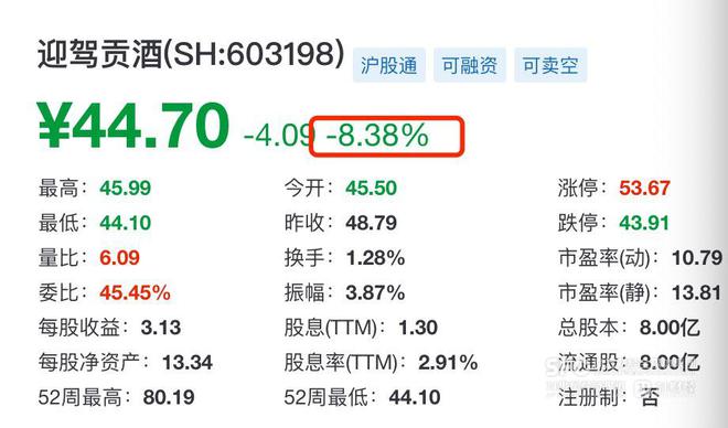 截至29日10点30分,迎驾贡酒股价44.7元/股,下跌8.38%,创下今年股价新低,市值约357亿元。