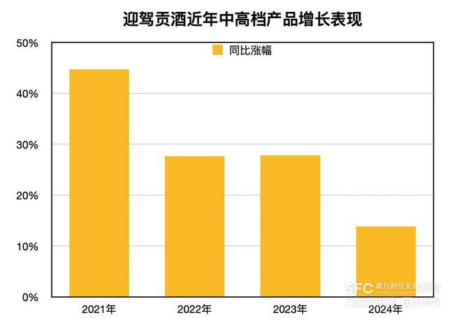 但对比往年,其高端化明显开始放缓。2021年至2023年,迎驾贡酒的中高档白酒营收同比增长分别为44.7%、27.6%、27.8%。