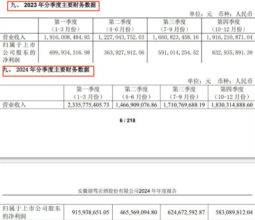 2024年第4季度,迎驾贡酒的营收在18.3亿元左右,同比大致下滑5.00%,归属于上市公司股东的净利润(以下简称“净利润”)在5.8亿元左右,同比大致下滑4.9%。