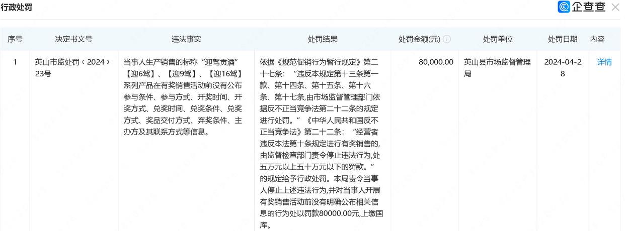 值得一提的是,迎驾贡酒还曾遭到行政处罚。2024年4月,迎驾贡酒因存在不正当竞争行为被湖北省英山县市场监管部门处以8万元罚款。