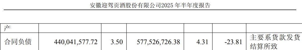 而在作为白酒企业的未来业绩“蓄水池”合同负债方面,截至2025年6月末,迎驾贡酒的合同负债在4.40亿元左右,较年初的5.78亿元左右减少约1.38亿元,降幅大致为23.8%。