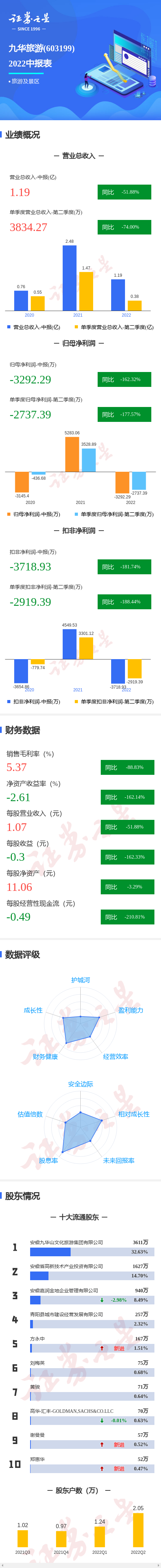 九华旅游2022中报显示,公司主营收入1.19亿元,同比下降51.88%;归母净利润-3292.3万元,同比下降162.32%;扣非净利润-3718.93万元,同比下降181.74%;其中2022年第二季度,公司单季度主营收入3834.28万元,同比下降74.0%;单季度归母净利润-2737.4万元,同比下降177.57%;单季度扣非净利润-2919.39万元,同比下降188.44%;负债率11.65%,投资收益275.73万元,财务费用-31.69万元,毛利率5.37%。