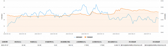 九华旅游7月27日大宗交易成交188.16万股,成交额6088.73万元,占当日总成交额的51.52%,成交价32.36元,较市场收盘价32.28元溢价0.25%。