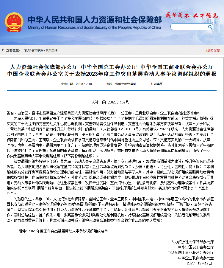 近日,人力资源社会保障部办公厅、中华全国总工会办公厅、中华全国工商业联合会办公厅、中国企业联合会办公室印发《关于表扬2023年度工作突出基层劳动人事争议调解组织的通报》,对2023年度工作突出的129家调解组织予以通报表扬,其中安徽九华山旅游发展股份有限公司劳动争议调解委员会成功入选全国第三批“百家金牌劳动人事争议调解组织”。