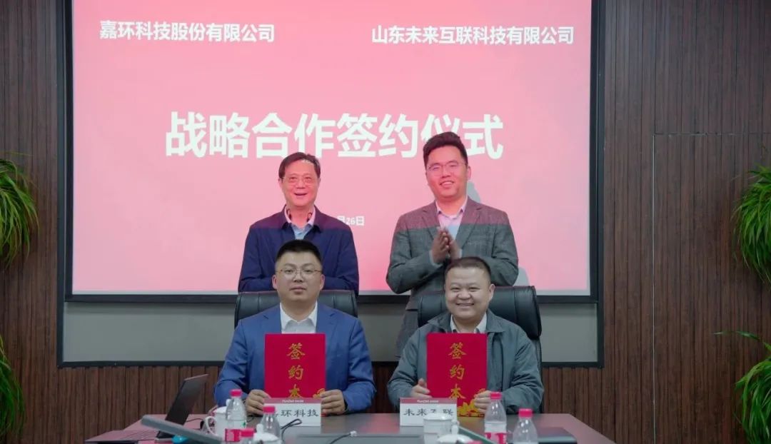 为积极响应工信部和山东省人民政府共同制定并发布的“人工智能一体化算力网络建设”战略,2025年3月26日,嘉环科技股份有限公司与山东未来互联科技有限公司(以下简称:未来互联)在济南达成战略共识。嘉环科技山东分公司总经理赵峰、未来互联市场部副总经理潘卫强分别代表双方正式签署全面战略合作协议,嘉环科技董事长宗琰、未来互联董事长郝帅共同见证。本次签约标志着两家行业领军企业在数智基建领域的深度协同迈入新阶段。