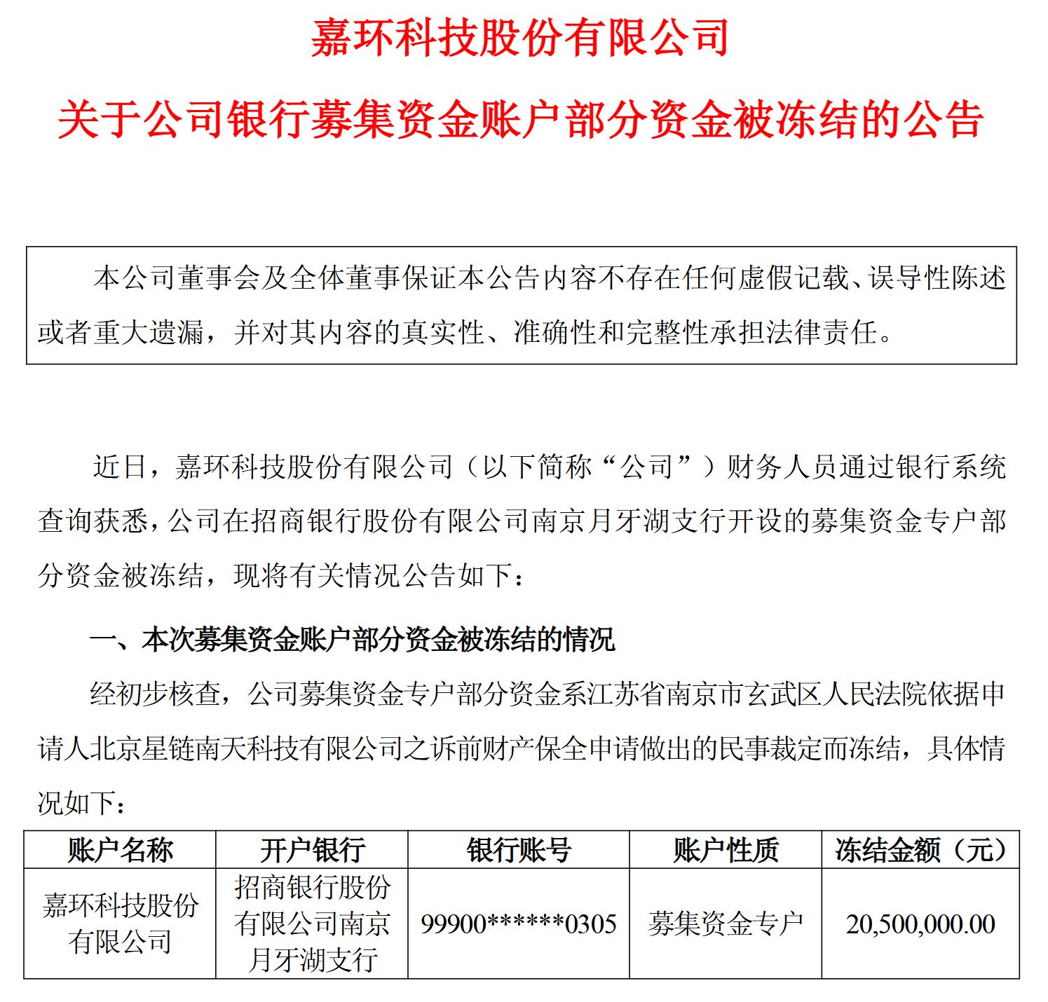 嘉环科技表示,截至公告披露日,公司募集资金专户被冻结账户资金余额2050万元,占公司最近一年经审计归母净资产的0.93%,占公司最近一期合并报表货币资金余额的3.80%。本次募集资金账户部分资金被冻结不会对公司生产经营活动造成重大不利影响。