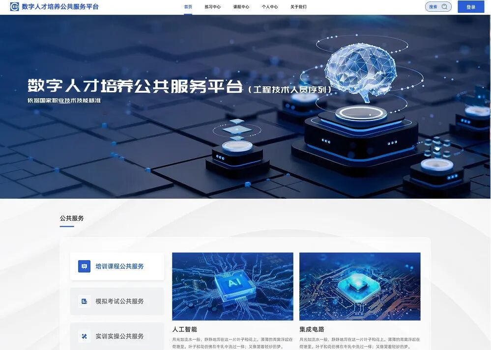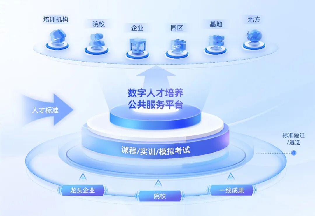 “数字人才培养公共服务平台”致力于系统化破解数字人才培养中的核心难题,包括教学资源不足、实训环境建设成本高、评价标准不统一等。平台整合了经国家职业标准验证、来自龙头企业及高校的优质课程资源与实训环境,全面覆盖人工智能五大职业方向(人工智能芯片产品实现、人工智能平台产品实现、自然语言及语音处理产品实现、计算机视觉产品实现、人工智能应用产品集成实现)及集成电路三大职业方向(集成电路设计、集成电路工艺实现、集成电路封测)。平台可面向各类培训机构、院校、企业、园区及基地等提供课程、实训与模拟考试等服务,有效降低各方投入成本,成为数字人才认证体系的关键支撑。