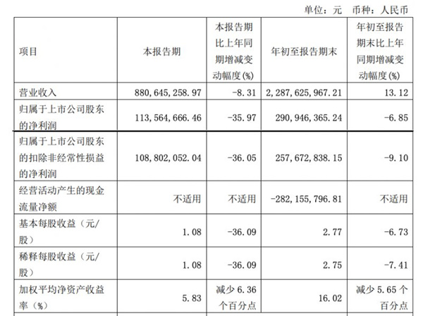 江山欧派(603208.SH)于10月27日发布2021年三季度业绩公告称,年初至报告期末公司实现营业收入约22.88亿元,同比增长13.12%;实现归属于上市公司股东的净利润约2.91亿元,同比减少6.38%。