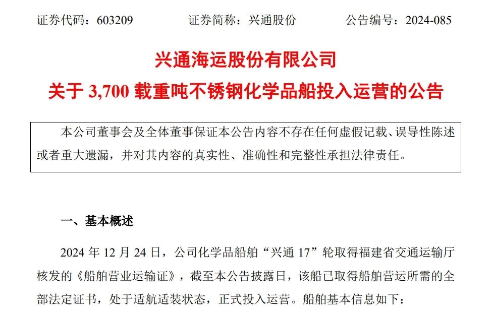 12月24日,兴通海运股份有限公司(以下简称“兴通股份”)发布公告,公司化学品船舶“兴通 17”轮取得福建省交通运输厅核发的《船舶营业运输证》,截至本公告披露日,该船已取得船舶营运所需的全部法定证书,处于适航适装状态,正式投入运营。