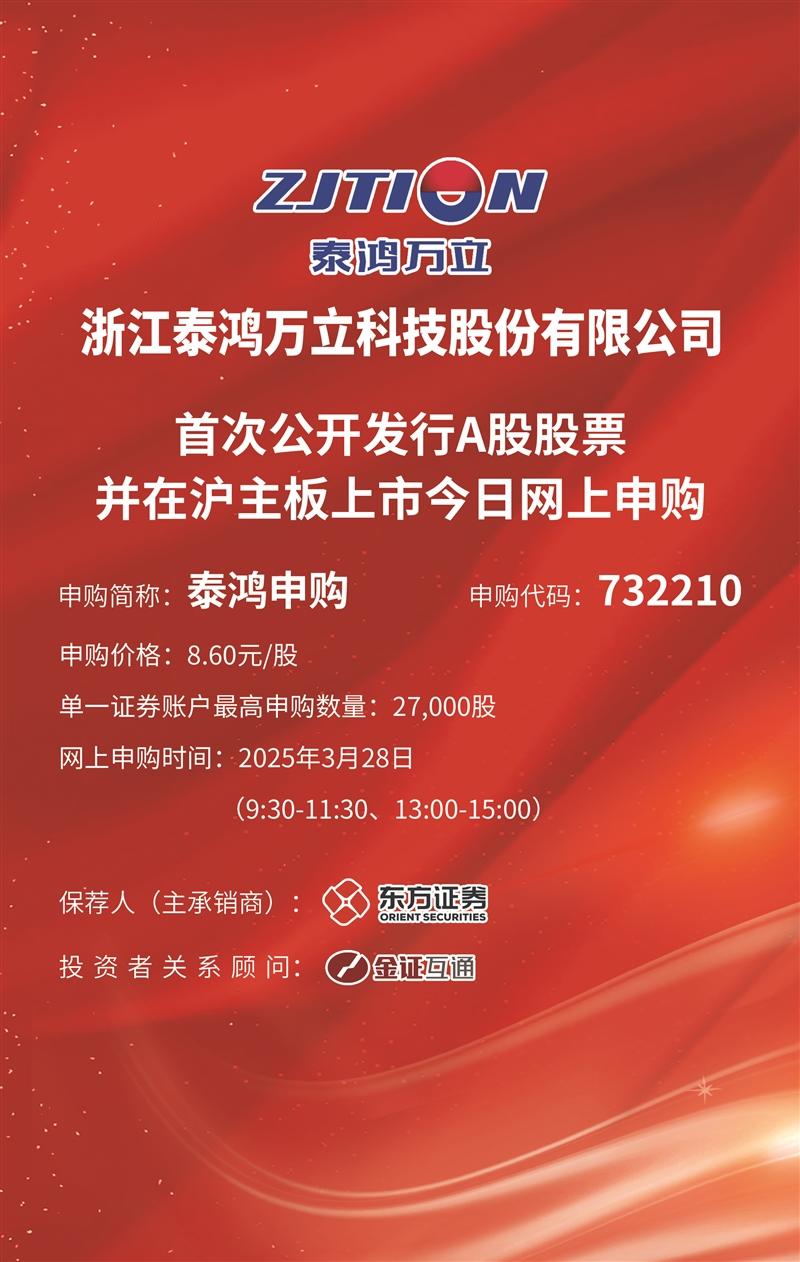 浙江泰鸿万立科技股份有限公司首次公开发行A股股票并在沪主板上市今日网上申购
