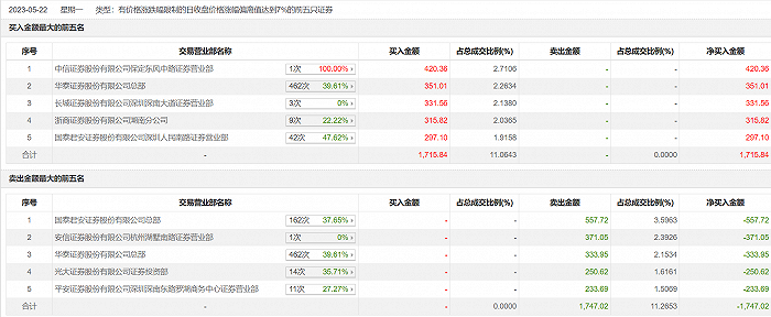 具体来看,中信证券保定东风中路证券营业部、华泰证券总部分别买入420.36万元、351.01万元;国泰君安证券总部、安信证券杭州湖墅南路证券营业部分别卖出557.72万元、371.05万元。