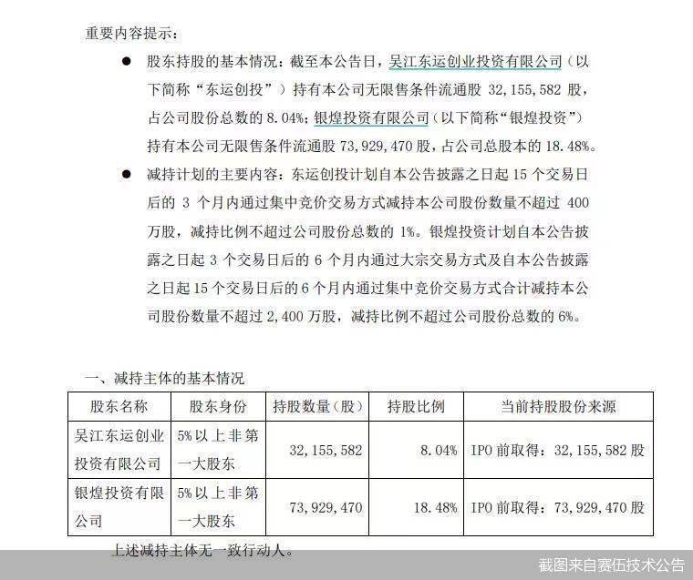 无独有偶,银煌投资作为赛伍技术的原始股东,亦有减持的计划。具体而言,银煌投资计划自该公告披露之日起3个交易日后的6个月内通过大宗交易方式及自公告披露之日起15个交易日后的6个月内通过集中竞价交易方式合计减持公司股份数量不超过2400万股,减持比例不超过公司股份总数的6%。