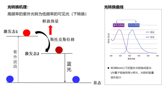 光转换机理:转光剂分子吸收光子能量后,其内部的电子从基态跃迁到激发态。处于激发态的电子不稳定,会在极短时间内返回基态。将高频率的紫外光转为低频率的可见光,在高频率紫外线的照射下,它到了激发态1。激发态1会跃迁回基态,回基态的时候会产生蓝光,从紫外光转成蓝光。(资料来源:赛伍技术内部资料)