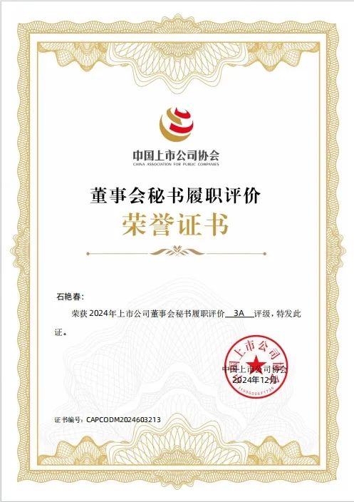 此次荣获“董办优秀实践案例”和“董秘履职3A评价”,不仅体现了资本市场对董秘履职能力的认可,更加彰显了业界对公司在强化规范运作、高质量信息披露、加强投资者关系管理和履行社会责任等方面工作的充分肯定。未来,公司将不断提升规范运作水平,推动公司治理、信息披露、投资者关系管理等重点工作再上新台阶,以稳健的业绩、真诚的服务回馈投资者和各方利益相关者,为资本市场健康稳定发展贡献镇洋力量。