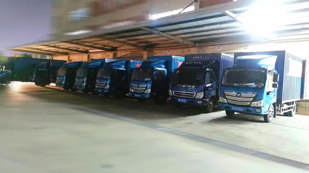 (爱婴室员工自建车队集结完毕,准备送货。)