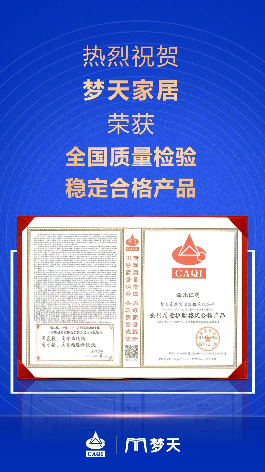 继2021年后,中国质量检验协会开展的2022年“3.15”国际消费者权益日“产品和服务质量诚信承诺”主题活动中,梦天家居再度获得“全国质量检验稳定合格产品”、“全国家具行业质量领先企业”、“全国产品和服务质量诚信品牌”和“全国产品和服务质量诚信示范企业”四项认可。