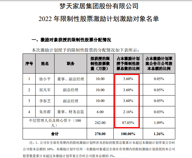 据梦天家居发布的《2022年限制性股票激励计划激励对象名单》中激励对象获授的限制性股票分配情况显示,董事、副总经理徐小平、副总经理屈凡军、副总经理李春芝拟获授的限制性股票为10万,占本激励计划授予限制性股票总数的比例3.6%,董事、财务总监朱亦群获得6.00万股占本激励计划授予限制性股票总数的比例2.16%。剩余的激励股被100名中层管理人员及核心骨干获得。