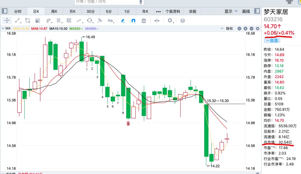 截至发稿,梦天家居二级市场上每股报价14.70元,盘中上涨0.41%,总市值32.54亿元。