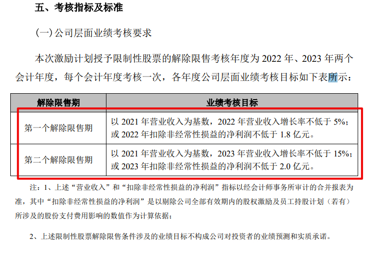 第一个解除限售期以2021年营业收入为基数,2022年营业收入增长率不低于5%;或2022年扣除非经常性损益的净利润不低于1.8亿元。第二个解除限售期以2021年营业收入为基数,2023年营业收入增长率不低于15%;或2023年扣除非经常性损益的净利润不低于2.0亿元。